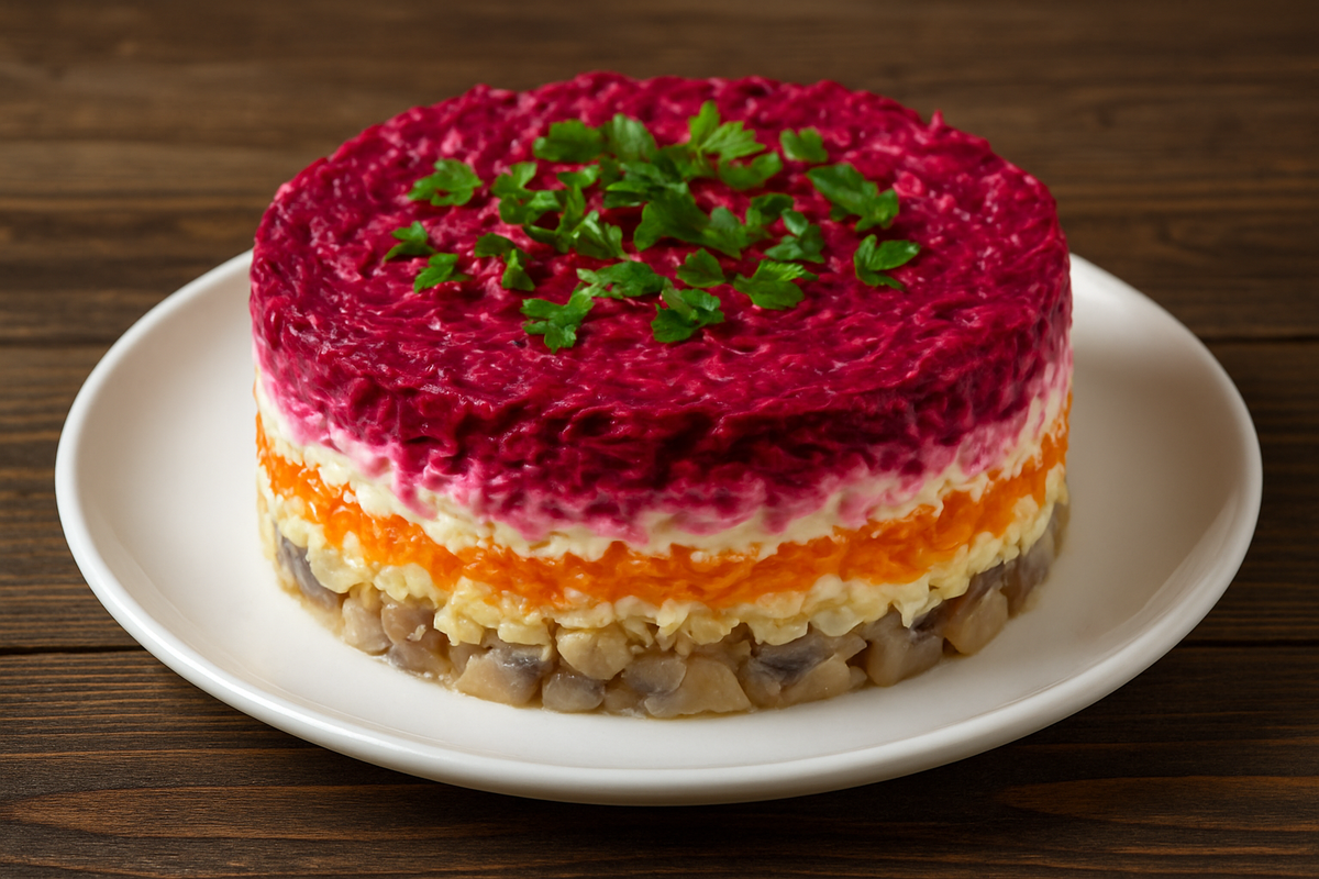 Этот классический салат, знакомый многим с детства, способен стать настоящим спасением на любом праздничном столе. Приготовление занимает всего 20 минут, а результат всегда впечатляет. Салат можно оставить в холодильнике, чтобы он настоялся и раскрыл свои вкусовые качества.