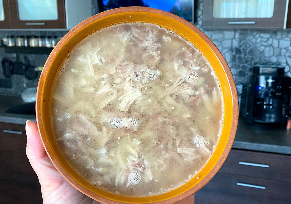 - Мясо достали из бульона, а сам бульон процедили.