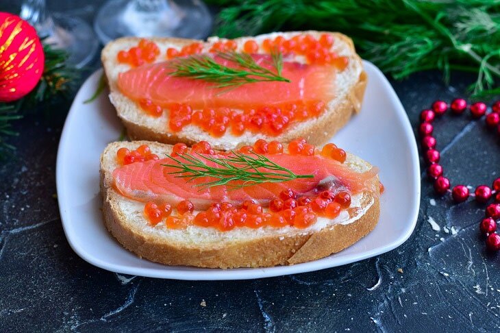 С помощью чайной ложки аккуратно добавьте красную икру по бокам от семги. Для финального штриха украсьте бутерброды веточками укропа. Альтернативой могут стать петрушка или мелко нарезанный зеленый лук.