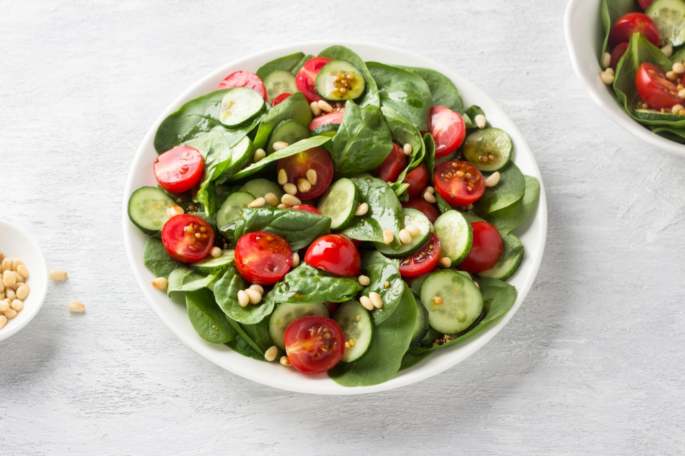 Помидоры черри разрезать пополам, а обычные помидоры нарезать кусочками, удалив мякоть. Затем огурцы нарезать кругами, при необходимости очистив от плотной кожицы. Разложить все подготовленные овощи на тарелке. Для создания хрустящей текстуры можно поджарить кедровые орехи на сковороде, помешивая их, чтобы они не подгорели.