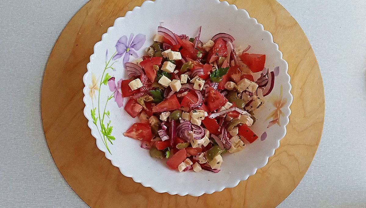 Перейдем к помидорам: порежьте их на кусочки, и не забудьте выбрать самые спелые, ведь именно от их вкуса зависит итоговый результат. Затем подготовьте оливки, разжав их плоской стороной ножа и убрав косточки. Добавьте их в салат.
