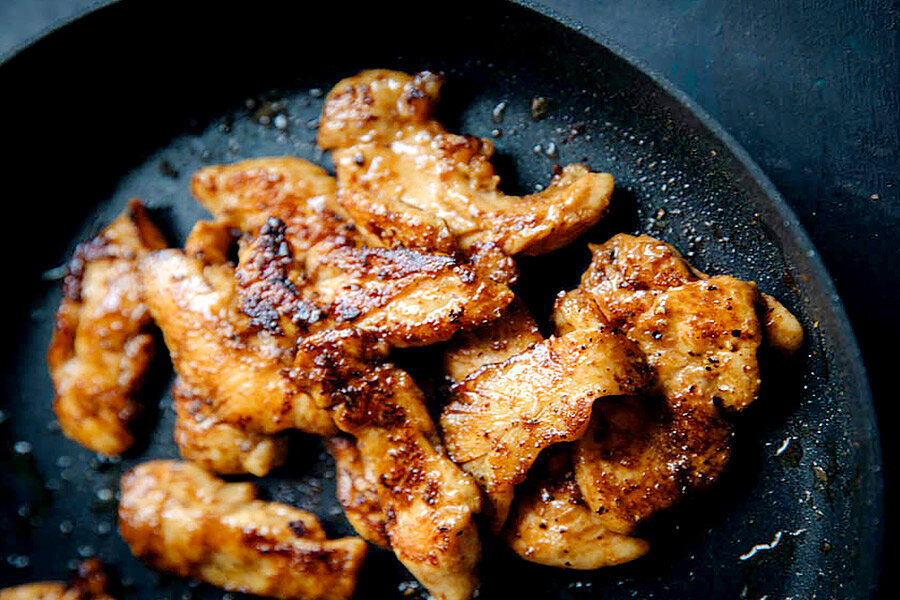 Куриное филе нарезать на небольшие кусочки, поместить в миску. Добавить все ингредиенты для маринада, тщательно перемешать и оставить на 20 минут для пропитывания.Разогреть сковороду на среднем огне, налить растительное масло. Выложить курицу в один слой и обжаривать до появления золотистой корочки с одной стороны (примерно 2 минуты). Перевернуть и дожарить до готовности с другой стороны, присыпав молотым черным перцем. Блюдо готово!Подавать на листьях салата с нарезанным огурцом и морковью.