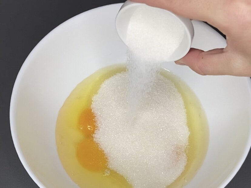 Начинать следует с взбивания яиц вместе с сахаром и ванильным сахаром с помощью венчика. Далее вливается кефир — он может быть прямо из холодильника, это не критично.