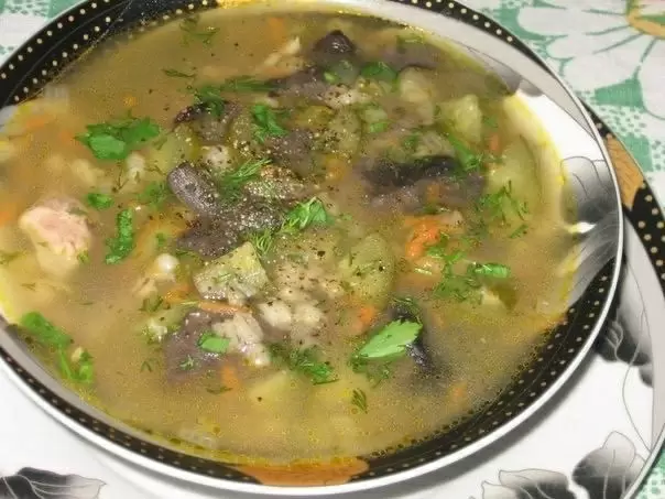 Заранее замочите перловку на несколько часов. Вскипятите мясной бульон и добавьте перловку. Через 10 минут добавьте грибы и варите, пока перловка не станет готовой, не менее 30 минут.