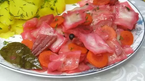 Рецепт в целом прост и понятен: килограмм капусты, свёкла, морковь и чеснок, маринад на литр воды с нужными специями, плюс уксус и масло. Так же можно адаптировать пропорции под собственный вкус и сезон.