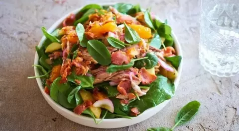 Натираем окорочка солью и перцем, оборачиваем в фольгу и добавляем белое вино. Запекаем в духовке при 180 °C в течение 40 минут.Готовим заправку: снимаем цедру с апельсинов и смешиваем ее с уксусом, медом, 2 ст. л. оливкового масла, солью и перцем.С апельсинов убираем кожуру и вырезаем филе. Сок, который выделится при нарезке, добавляем в заправку.Очистив яблоки, нарезаем их дольками и обжариваем бекон до хрустящей корочки. В оставшемся жире обжарим яблоки по 5 минут с обеих сторон, посолив и поперчив.Лук нарезаем тонкими перьями и соединяем с обжаренными яблоками и филе апельсина, добавляем в заправку. Откладываем мясо утки и разбираем его на волокна (кожицу можно поджарить до хрустящего состояния).На тарелки выкладываем шпинат, сверху помещаем утку, яблоки, апельсины и лук, поливаем заправкой. Посыпаем раскрошенным беконом и подаем к столу.