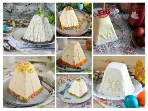 500 г 7% творога, 100 г сметаны, 100 г сливочного масла, 100 г сахарной пудры, 100 мл воды, 50 г мака, 50 г сахара, 1 ч.л. лимонной цедры и 0,5 ч.л. куркумы. Калорийность: 241 кКал. Время приготовления: 30 минут. - Творожная пасха с белым шоколадом