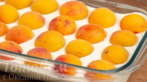 5. Подготовьте абрикосы, разрезав их пополам и удалив косточки. Выложите половинки срезом вниз на творожную массу. Если вы хотите, замените абрикосы другими фруктами или ягодами.