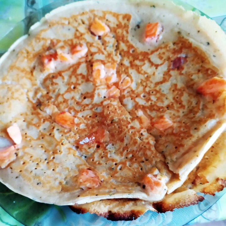 Сначала в планах было нафаршировать блины паштетом из куриной печени, но в морозильнике обнаружился кусочек солёной красной рыбы, который оказался в самый раз для этого блюда.
