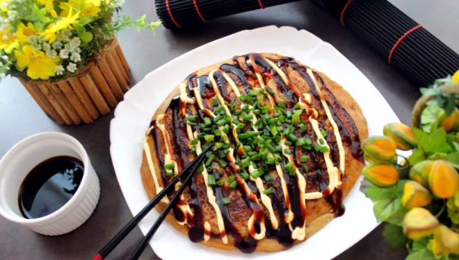 Для начинки можно использовать классическую комбинацию из капусты (200 г), свинины (80 г), хрустящих шкварок (тэнкасу) и зелёного лука. Для подачи нужны соус окономияки, японский майонез и стружка тунца — кацуобуси.