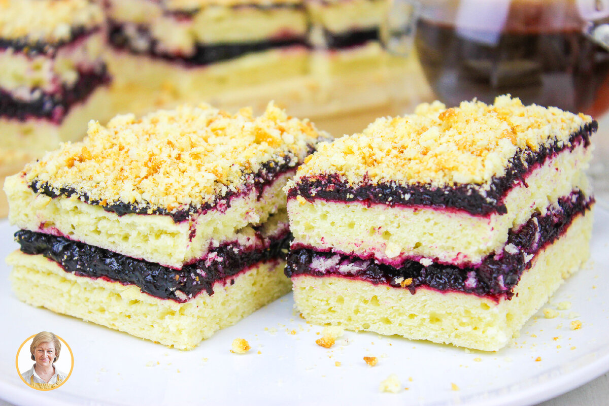 На один из коржей распределить половину ягодной начинки, накрыть вторым коржом и опять смазать начинкой. Обрезки теста измельчаются в крошку, которой равномерно покрывают верх пирожного. Дать настояться 1-2 часа, чтобы коржи хорошо пропитались. После этого пирожное нарезают на порционные кусочки. Приятного аппетита!