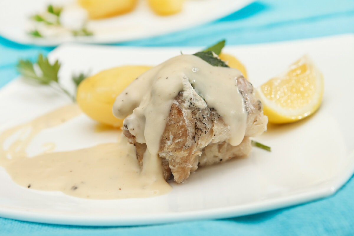 Подавать готовое блюдо на подогретых тарелках, поливая сверху свежевыжатым лимонным соком. Гарнир, например отварной картофель или рис, идеально дополнят этот кулинарный шедевр.