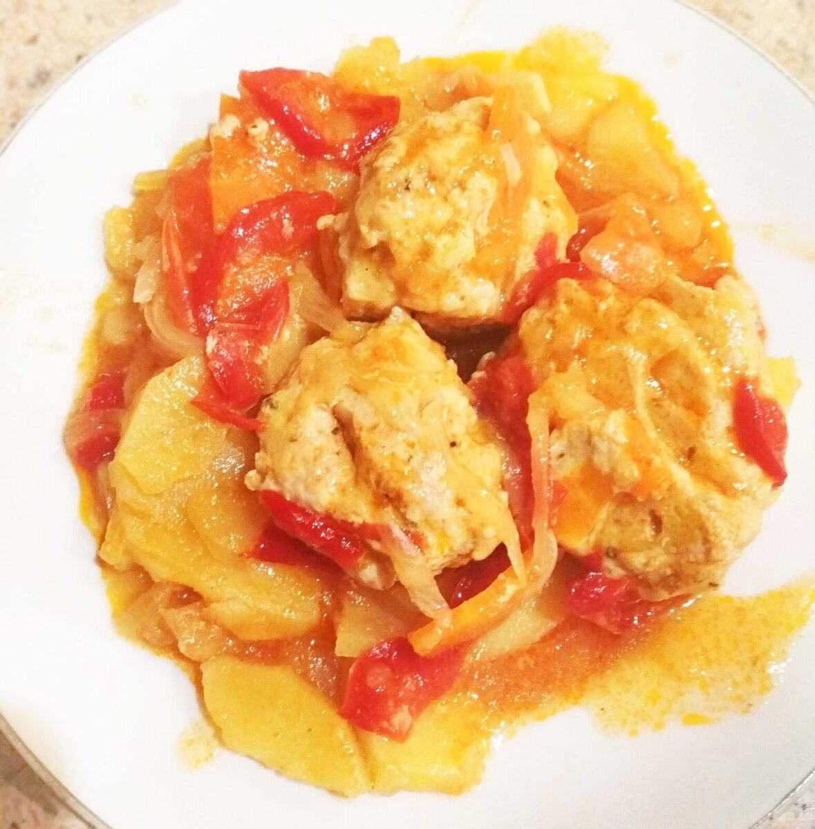 Фарш формируется в небольшие шарики и укладывается прямо на перец. Если они плохо формируются, добавление панировочных сухарей поможет достичь нужной консистенции. Далее, 3-4 столовые ложки томатной пасты разводятся в 150-200 мл воды и осторожно вливаются в сковороду. Доливается немного растительного масла, после чего все накрывается крышкой и тушится на среднем огне около 45-50 минут. И вот, тефтели с картошечкой и болгарским перцем готовы к подаче!
