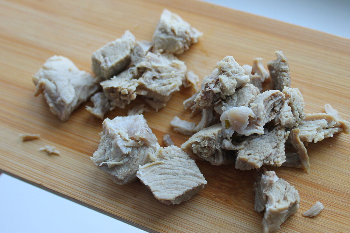 Лучше всего использовать качественно отваренное мясо. Оно должно быть свежим, чтобы блюдо получилось вкусным. Мясо нарезается на небольшие кусочки, можно использовать пластинки для более оригинальной подачи.