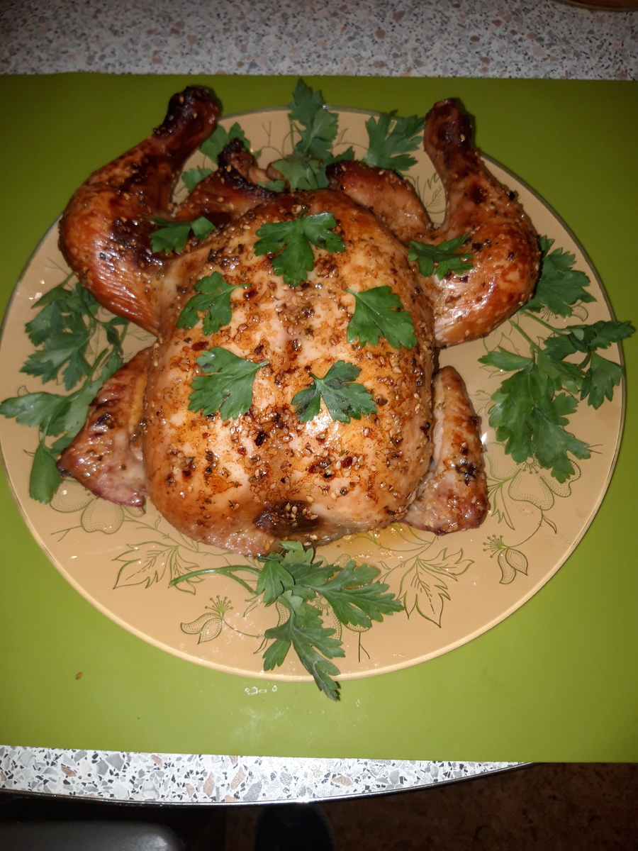 Курицу стоит тщательно промыть и обсушить. Затем её следует хорошо смазать получившимся маринадом, как снаружи, так и внутри. Для более насыщенного вкуса маринование можно проводить в течение нескольких часов, а процесс выпекания займет около часа. После маринования курицу ставят в разогретую до 200°C духовку и запекают 40 минут, затем удаляют фольгу и готовят еще 20 минут до образования золотистой корочки.