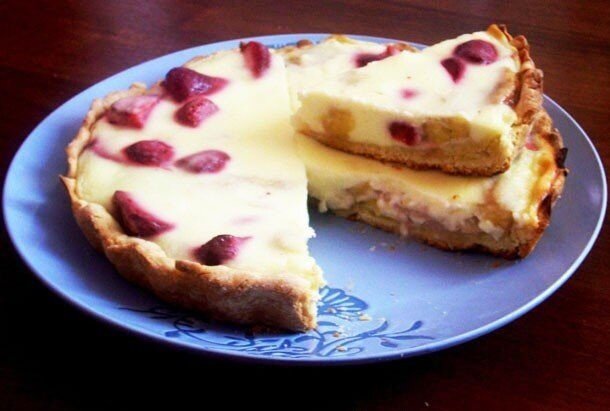 7. Вытаскиваем его и начинаем процесс сборки: выкладываем нарезанные фрукты и заливаем сметанной смесью. Выпекаем еще 20-25 минут до готовности, пока начинка не загустеет.