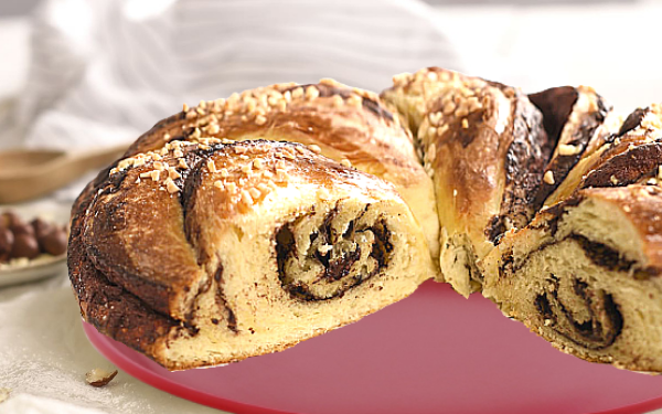 Охлажденное тесто раскатывают на противне, затем нанесли шоколадную начинку равномерно. Рулет сворачивается и переплетается, оставляя красивую шоколадную сторону внешний. Образованная "косичка" укладывается в форму и оставляется на расстойку.