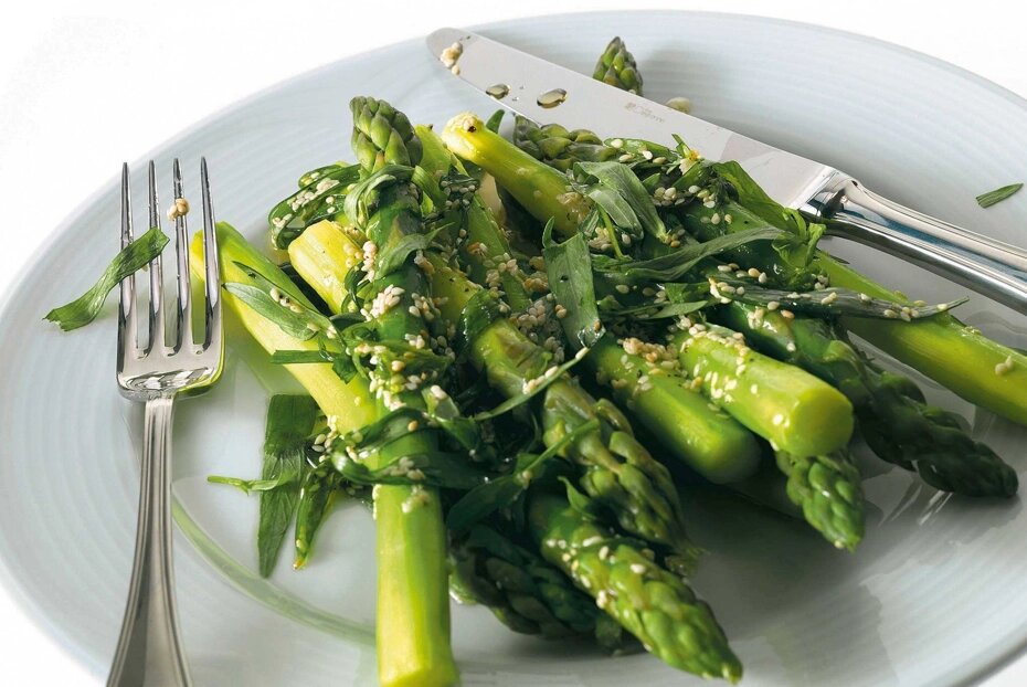 2. Листья эстрагона необходимо аккуратно отделить от стеблей и смешать с оливковым и кунжутным маслами, давленым чесноком, немного обжаренными кунжутными семечками, солью и перцем. Получившимся соусом заливаем охоложденную спаржу. Салат лучше подавать с розовым вином, например, каталонским или провансальским, что подчеркнет его свежесть и оригинальный вкус.