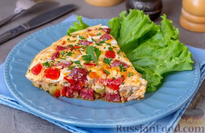 Яркий омлет с колбасой и овощами