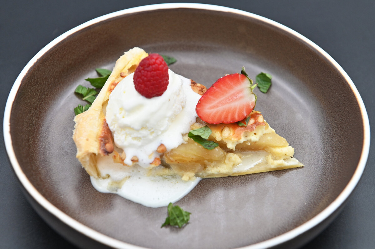 Сначала очищаем яблоки от кожуры и удаляем семена. Нарезаем их дольками толщиной около 1 см.На разогретую сковороду добавляем сливочное масло и палочки корицы. Как только масло растопится, вводим часть сахара и нарезанные яблоки. Перемешиваем и добавляем оставшийся сахар, снова вмешиваем в массу. В конце вливаем коньяк и томим на медленном огне.Рекомендуется избегать использования лопатки, чтобы не повредить форму дольков. Лучше приподнять сковороду и аккуратно встряхнуть ее содержимое.Раскатываем тесто в квадрат, который будет немного больше формы для выпечки.Выложите тесто в форму, уберите лишнее с помощью ножа или скалки. Не забудьте проткнуть тесто вилкой для равномерного пропекания.Взбейте яйца с сметаной и налейте часть смеси на дно теста.Сверху равномерно распределяем карамелизированные яблоки. Затем добавляем остатки яичной массы на 5-6 мм ниже краев формы, посыпаем кедровыми орехами и корицей.Выпекаем пирог в духовке при 180 градусах около 10-15 минут.После выпечки нарезаем на кусочки и подаем с любимым мороженым, свежей мятой и ягодами.Приятного аппетита! Попробуйте этот невероятный десерт, и он станет звездой вашего стола.