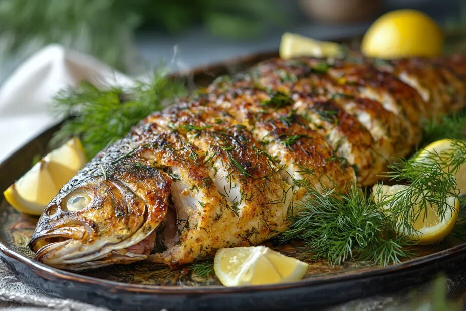 4. Подача: дать рыбе немного «отдохнуть» после духовки, потом аккуратно переложить на сервировочное блюдо, украсить лимоном и зеленью. Подавайте горячим и наслаждайтесь вместе с близкими.