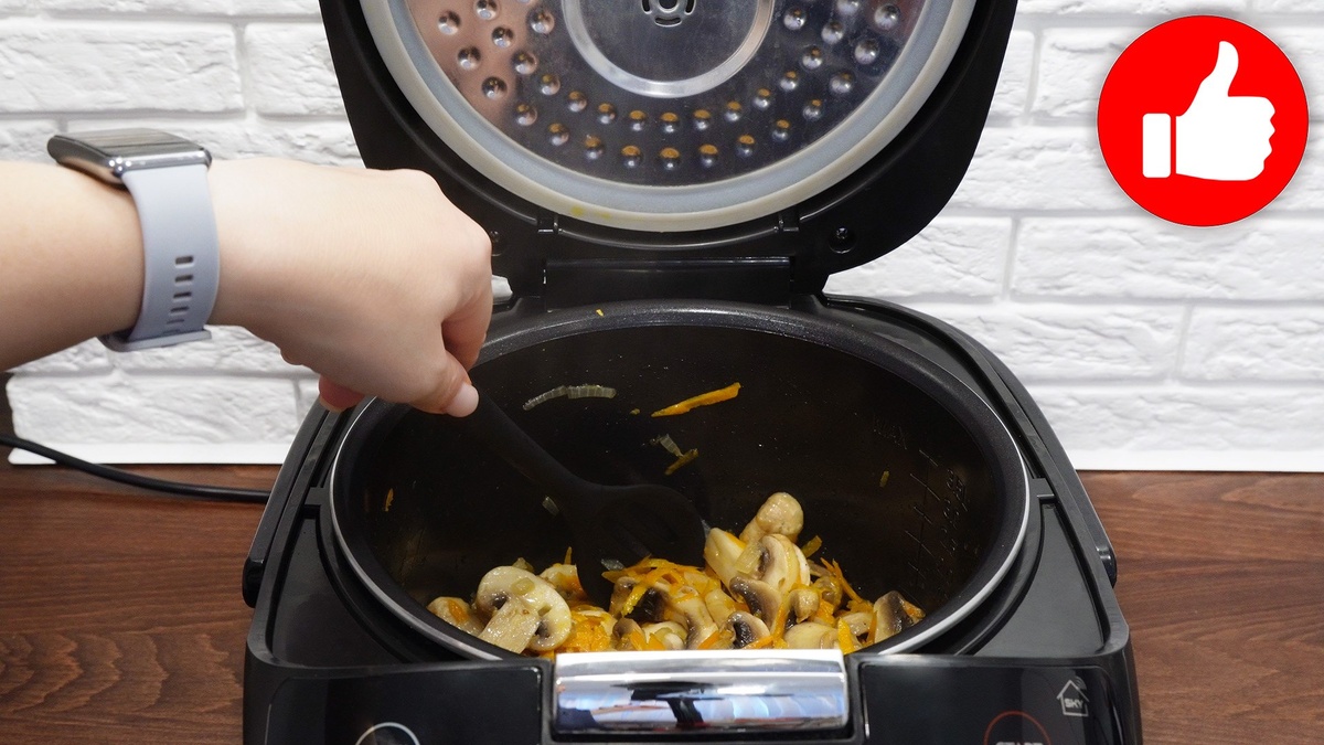 Вернитесь к мультиварке. Налейте подсолнечное масло и выберите режим «Жарка» на 15 минут. Обжарьте лук, морковь и грибы в течение 5 минут.