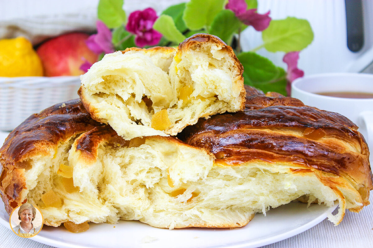 По истечении времени тесто должно увеличиться в размере. После нежно обминаемый его раскатывают в прямоугольный пласт, смазывают маслом и посыпают цукатами. Сворачивают в рулет и заплетают в косичку. Подготовленный пирог помещают в форму, накрывают и оставляют на расстойку на 40 минут.