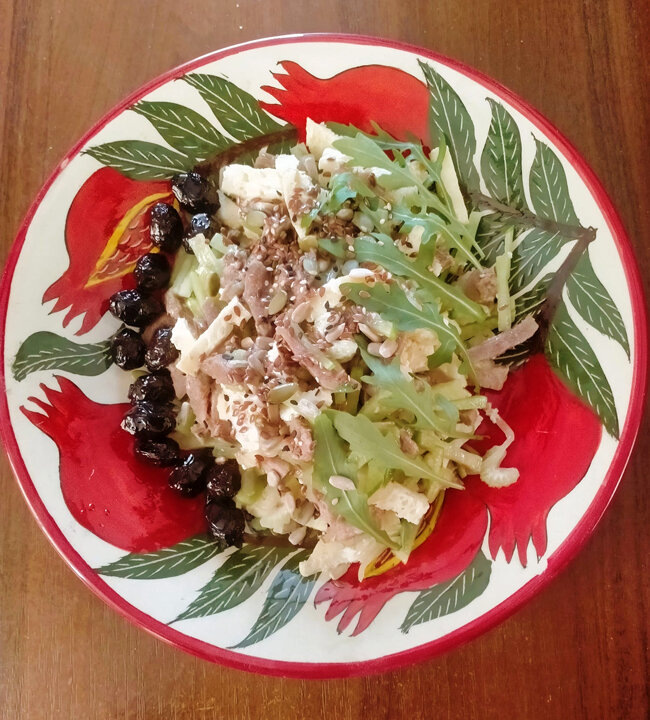 Стебель сельдерея, нарезанный мелкими кусочками, добавляется к остальным ингредиентам. Все компоненты аккуратно перемешиваются. Для завершения на салат посыпают семечки, украшают руколой и маслинами, поливают лимонным соком и оливковым маслом.
