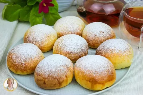 Готовые булочки стоит посыпать сахарной пудрой, чтобы добавить им немного изысканности. Наслаждайтесь свежими и ароматными творожными булочками с повидлом — это поистине лакомство!