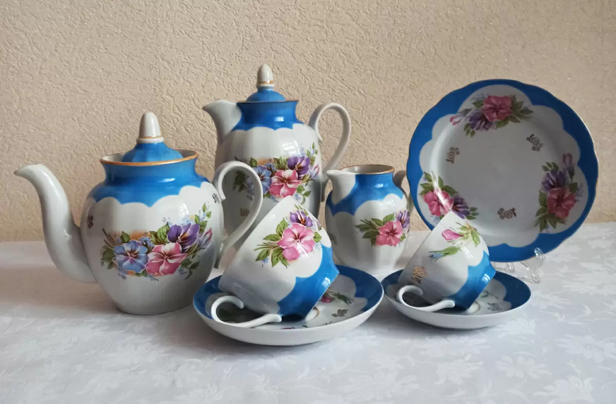 К сожалению, в целости остались лишь несколько предметов: кофейник, чайник, молочник, десертная тарелка, чайная и кофейная пары. Чайная пара украшена цветами, а кофейная - мелкими полевыми цветами на блюдцах. Каждый элемент сервиза стремительно погружает в атмосферу элегантности и уюта.