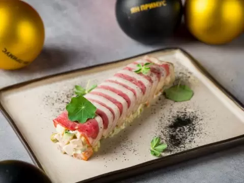 Шеф-повар предлагает освежённую версию традиционного оливье: вместо привычного отварного набора — запечённые овощи и тонкие слайсы холодного копчёного утиное филе. Рецепт сохраняет суть салата, но добавляет глубину вкуса и визуальную элегантность.