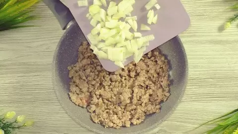 Начните с обжаривания фарша на сковороде с растительным маслом в течение 2-3 минут. Если он слипается, добавьте немного воды. Затем добавьте нарезанный лук и жарьте до готовности, приправляя солью и перцем по вкусу.