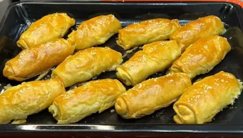 Когда тесто будет готово, аккуратно вытяните его в тонкие слои. На середину каждого круга положите начинку, затем скрутите пирожок в рулет, оставляя свободные края. Выкладывайте их на противень, смазанный растительным маслом.
