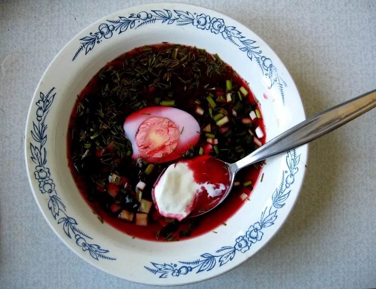 Заполните тарелки остывшим свекольным отваром и добавьте ложку сметаны для завершения вкуса. Таким образом, каждый сможет насладиться прохладным и легким супом, который идеально подойдет для знойного дня!