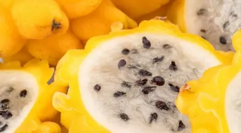 Этот экзотический плод, имеющий различные цветовые варианты, наиболее сладок среди желтых. Его вкус напоминает смесь киви и груши с легким медовым оттенком, при этом съедобной является только белая мякоть и семена.