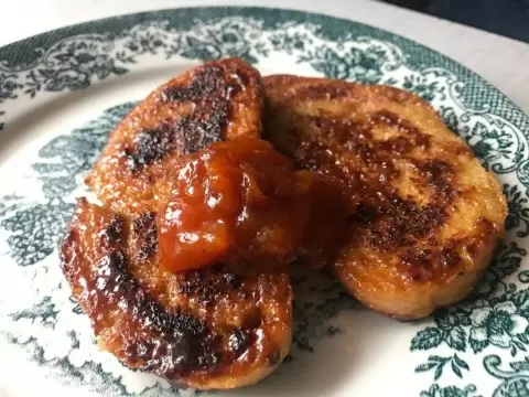 8. Когда карамель приобретет золотистый цвет, аккуратно снимите гренки со сковороды, сохранив карамельный слой.