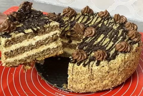Когда бисквит остынет, его следует разделить на три коржа. Подготовьте сироп для промачивания коржей, чтобы торт был более сочным. Начинайте собирать торт, чередуя коржи с кремом. Завершите оформление, посыпав десерт молотыми орехами и декоративной стружкой шоколада. Оставьте торт в холодильнике на минимум час, чтобы он впитался и охладился.