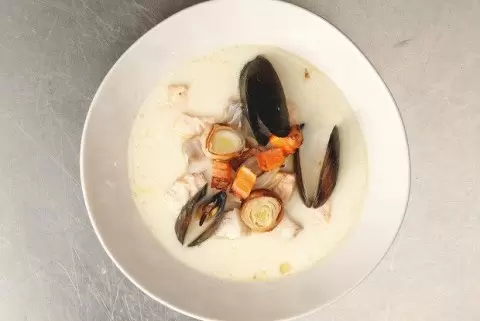 Подготовка овощей: Очистите и нарежьте различные овощи. Запеките их со сливочным маслом в духовке при температуре 220°C до тех пор, пока они не станут мягкими, но не превращаются в кашу.Приготовление мидий: Варите мидии в кастрюле с водой на протяжении 3-4 минут. После варки очистите их, отложите в сторону, а бульон сохраните для дальнейшего использования.Создание бульона: В рыбном бульоне отварите рыбу на несколько минут. Затем вытащите рыбу, а в бульон добавьте белое вино и воду, в которой варились мидии. Увеличьте огонь и дайте бульону увариться вдвое.Загустение бульона: В отдельной миске смешайте венчиком желтки со сливками. Перелейте эту смесь в бульон, продолжая готовить на среднем огне, пока масса не загустеет, избегая закипания.Подача: В глубокую тарелку выложите отваренную рыбу, запеченные овощи и картофель, добавьте мидии и щедро полейте бульоном. Украсить блюдо зелёным луком.Преимущества и советы