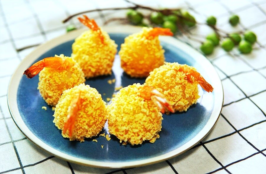 Отварите картофель, лучше всего, не очищая его от кожуры. После варки очистите и тщательно разомните, добавив соль и молотый перец для вкуса.Нарежьте моцареллу небольшими кусочками, чтобы удобно было начинки.Очистите креветки, оставив хвостики, и не забудьте удалить пищевод, сделав надрез вдоль спинки. Приправьте креветки солью и полейте Шаосинским вином, оставив на 5 минут для маринования.Сформируйте небольшой блинчик из картофельного пюре, положите на него кусочек сыра и креветку так, чтобы хвостик выглядел наружу. Закройте начинку картофельной массой и сформируйте аккуратный шарик с видимой частью хвоста.Каждый шарик обваляйте в муке, затем окуните во взбитое яйцо, и в завершение обваляйте в панировочных сухарях.Предварительно разогрейте духовку до 170°C и поместите противень с шариками на 25 минут. Время может варьироваться в зависимости от размера креветок и шариков.Подавайте с соусом в центре блюда, располагая вокруг хрустящие шарики.Приятного аппетита!