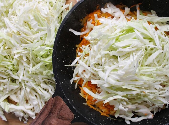 2. Затем добавляется тонко нарезанная капуста, которая готовится до золотистого оттенка.