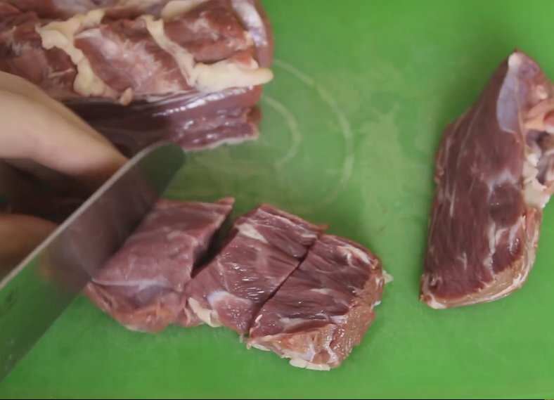 1. Начните с подготовки мяса: антрекот нарежьте тонкими слоями, а затем разделите на порционные кусочки.
