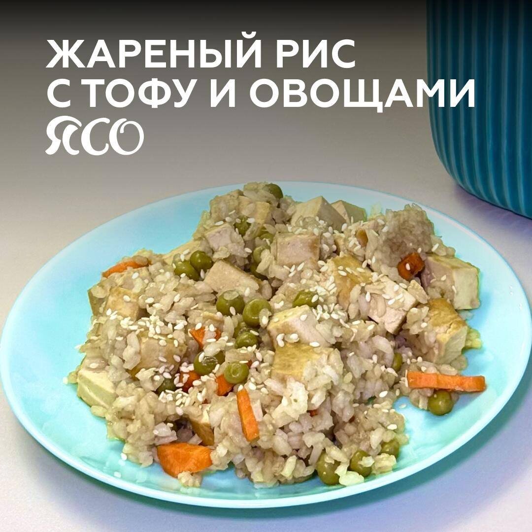 Подача:: После того как овощи обжарились, добавьте холодный рис, разбейте комки лопаткой и перемешайте с овощами и тофу. Полейте соевым соусом, позволяя ему равномерно распределиться, и готовьте еще 2-3 минуты до прогрева риса. В финале добавьте кунжутное масло и тщательно перемешайте.