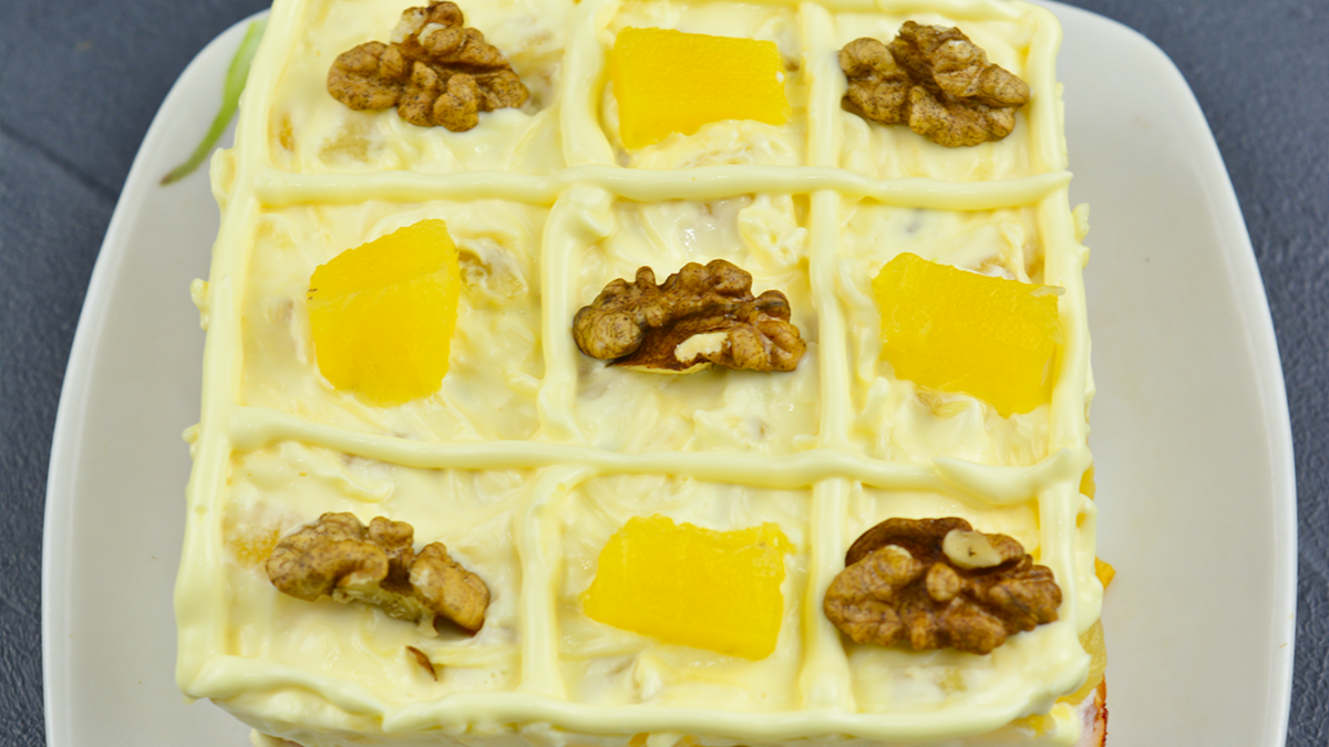 Пришло время создать шахматное поле. С помощью майонеза наносим нужный рисунок на поверхность. В качестве шахматных фигур идеально подойдут ананас и орехи, что сделает внешний вид салата ярким и оригинальным.