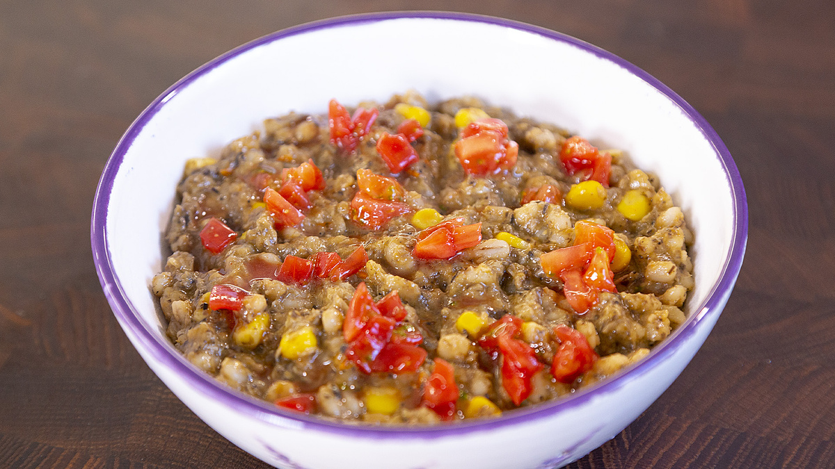 Затем на сухой сковороде обжарьте получившуюся массу в течение нескольких минут. После этого добавьте к ней перловку и кукурузу. Прогрейте всё вместе около 5 минут, постоянно помешивая.