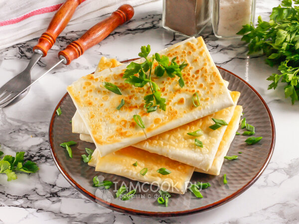 Приготовление: Разогрейте духовку до 180 °C, сложите тесто фило, дополните сыром и творогом, скрутите в форму и запекайте до золотистой корочки.