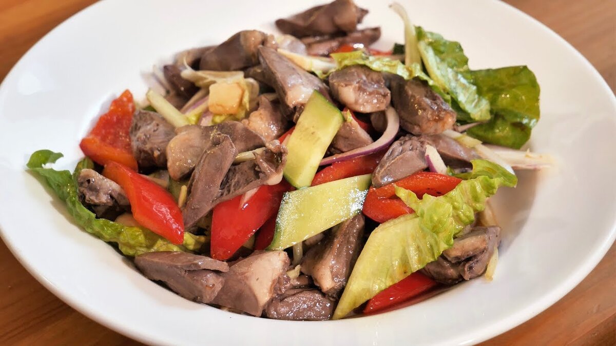 Итак, получается невероятно вкусное, питательное и полезное блюдо, в котором сердечки становятся нежными и ароматными, а сочетание свежих овощей придает салату изысканность.